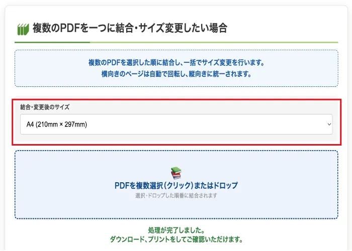 まずは変換したいサイズを選択し、次に変換したいPDFデータを選択、もしくはドロップするだけで一括で処理されます。